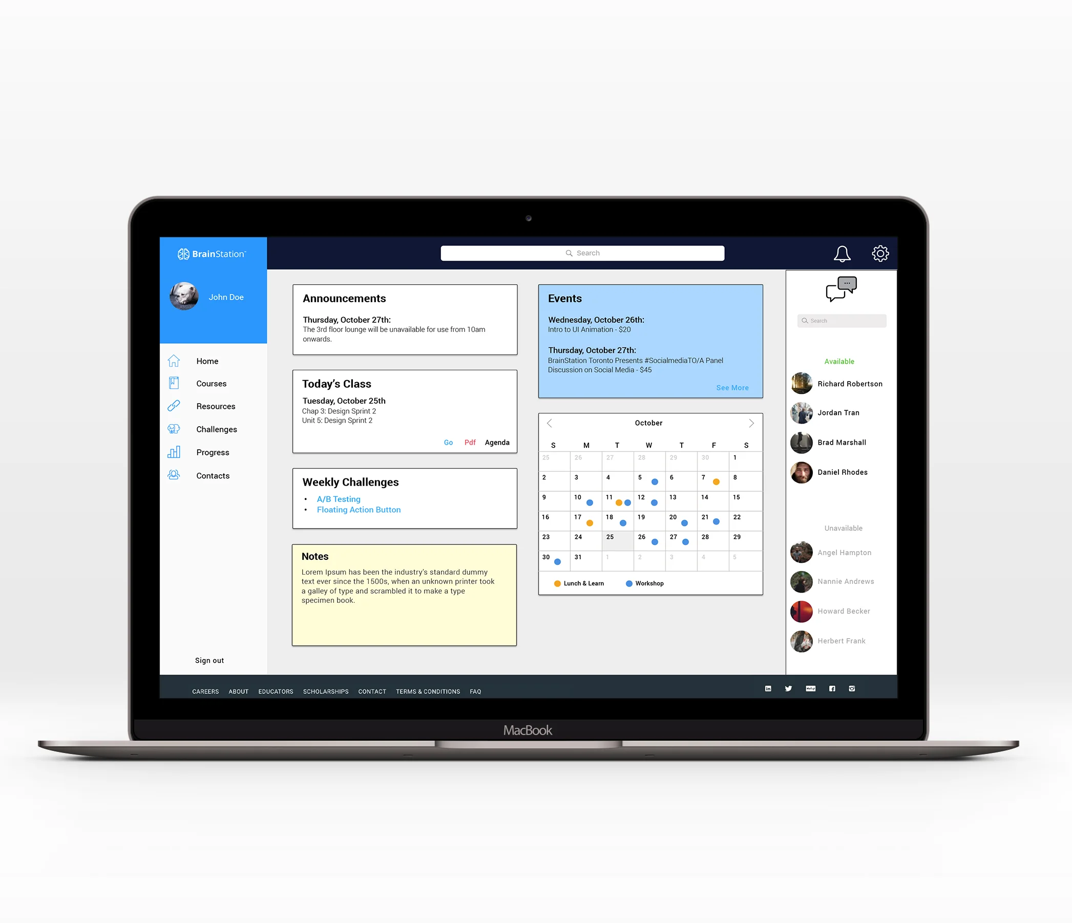 For design consistency, we began with developing a wireframe template before each working on our own part. The template included the top and vertical navigation bar based on the BrainStation style guide.