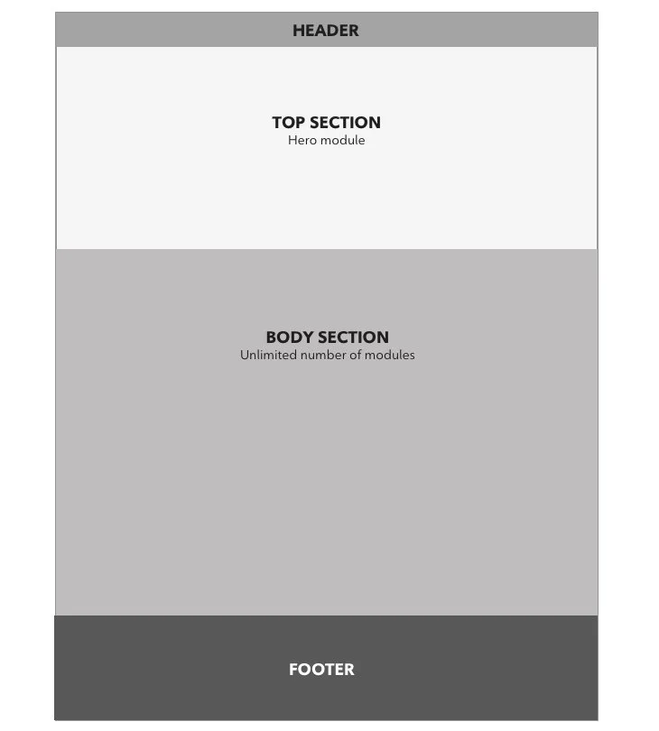 I established that I needed to design template pages for the editors to use. The pages would be made of modules, some modules would be content specific while others would be content agnostic and reusable. This solution would allow editors to choose the most suitable modules for their content while maintaining design consistency on the website.