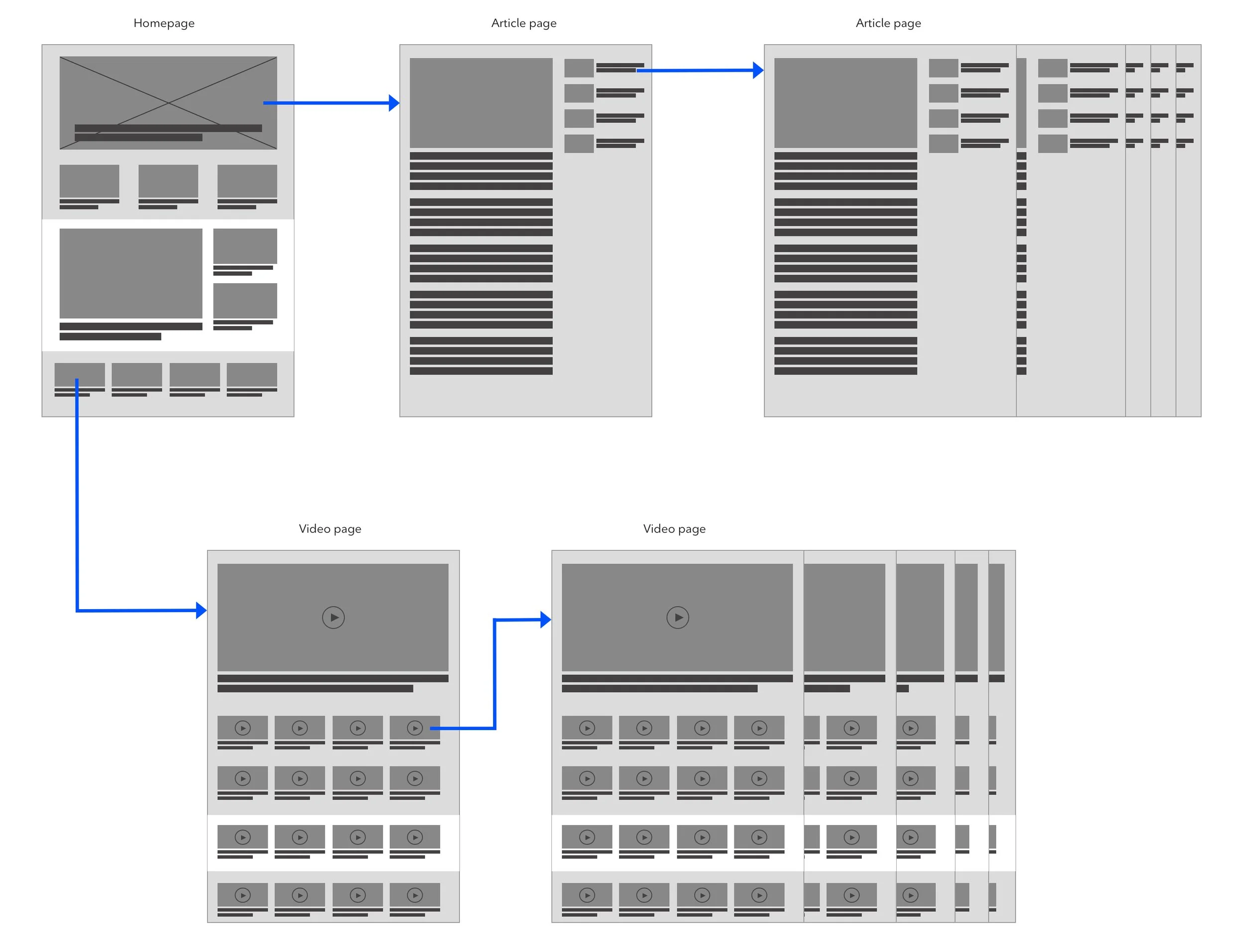 On desktop, I envisionned the homepage to be made of two sections. The first section would contain a hero module, a specific module for the homepage above the fold for the main headlines, and the second section would contain content agnostic modules editors would place based on topics to publish.