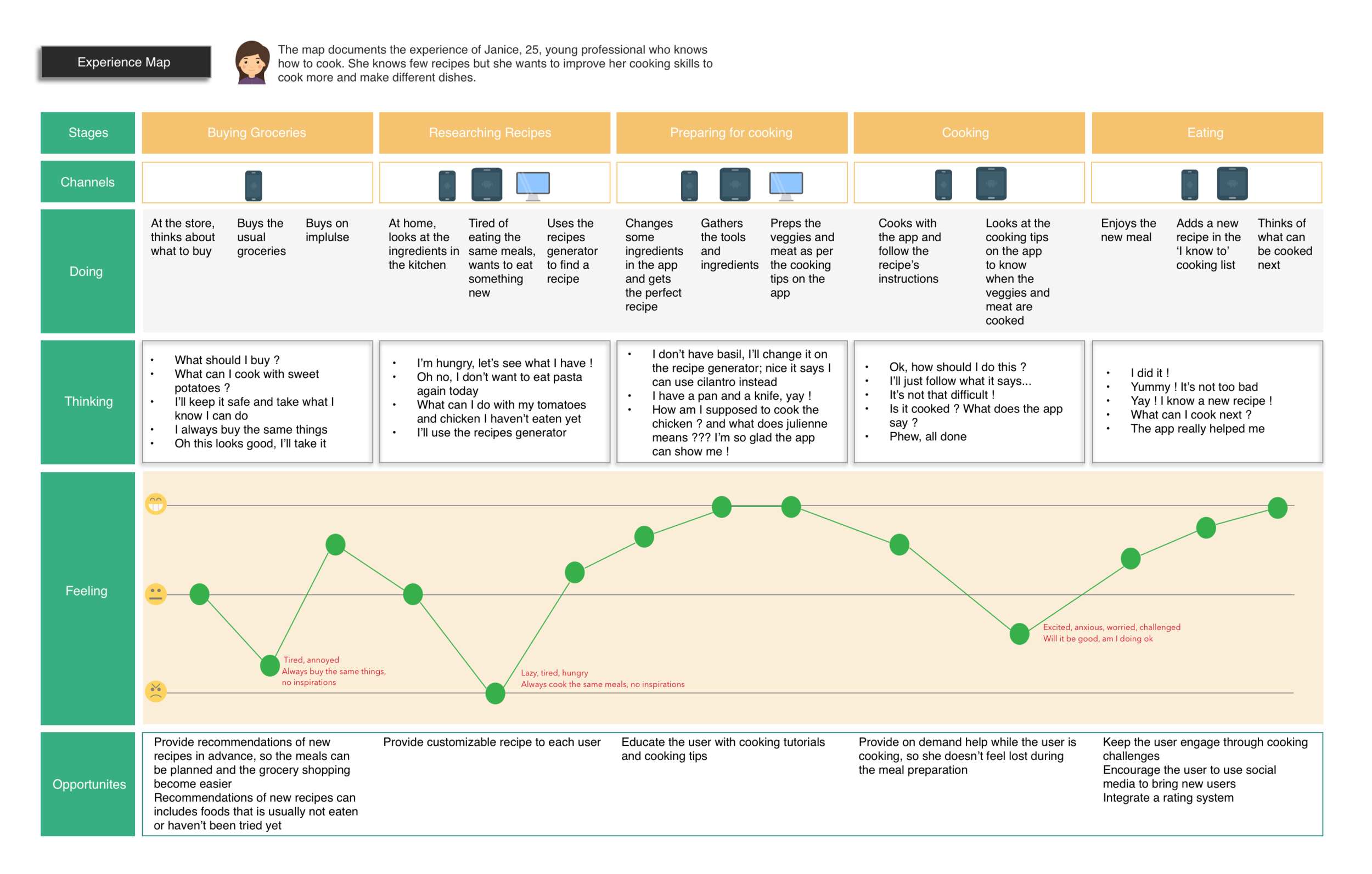 For the app prototype, I used the Experience Map to prioritize the 'researching recipes', 'preparing for cooking' and 'cooking' steps because they presented the best opportunity areas.