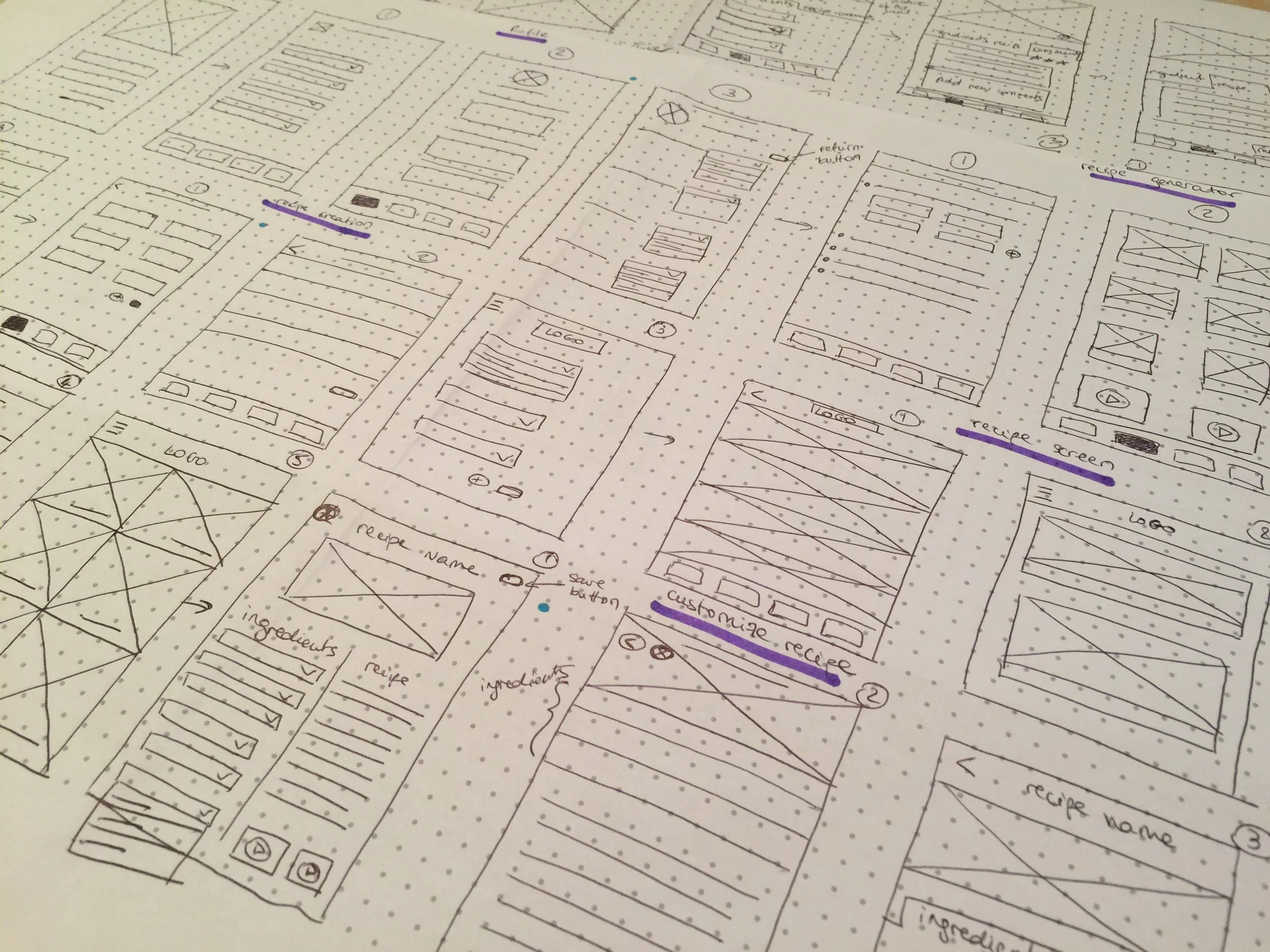 Consequently, I decided that creating an account, searching for recipes, customizing recipes, saving favourite recipes and receiving cooking tips were the key features. With the features established I created a user flow and started wireframing.